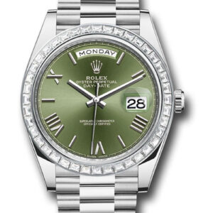Rolex Day-Date 40 Baguette Diamond Bezel Olive Green Roman Dial President Bracelet 228396TBR German Day Wheel