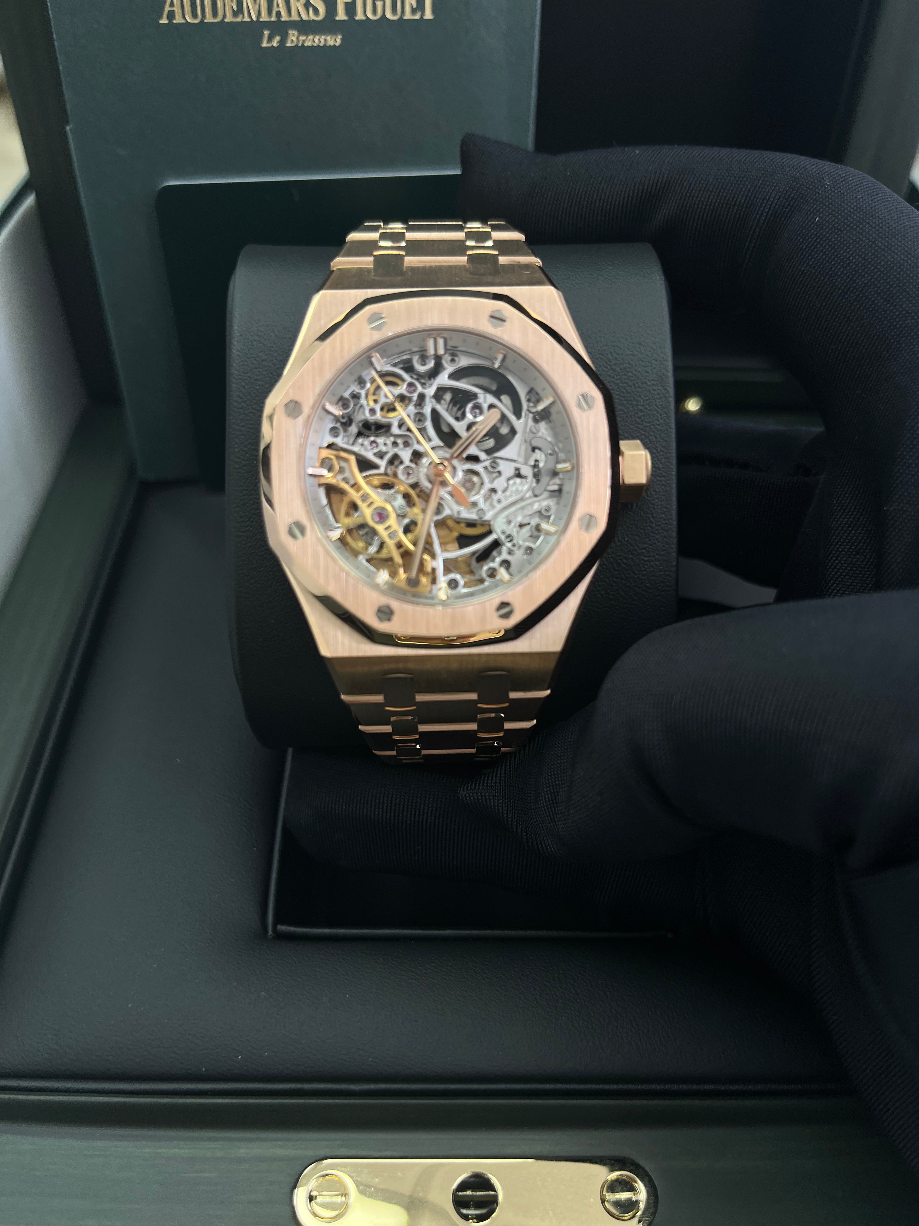 18-carat pink gold case, glare-proofed sapphire crystal, and case back, screw-locked crown. Manufacture calibre 3132, hours minutes, centre seconds with a selfwinding mechanism. The number of jewels is 38 Openworked rhodium-toned dial, pink gold applied hour-markers, and Royal Oak hands with luminescent coating. 18-carat pink gold bracelet with AP folding clasp. 18-carat pink gold bracelet with AP folding clasp. With a power reserve of 45h and water-resistant up to 50 meters.