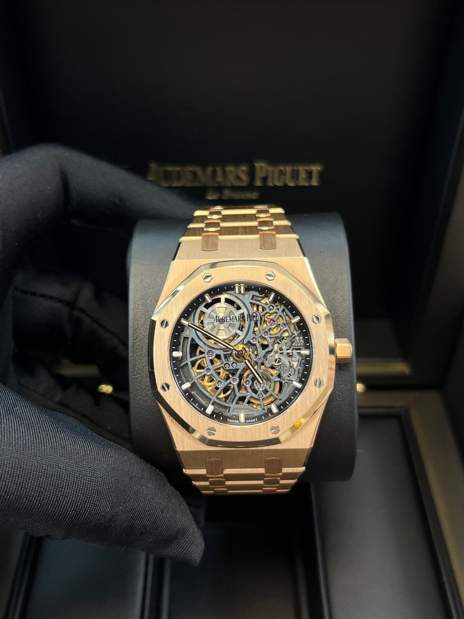 16204OR.OO.1240OR.01. 18kt rose gold 39mm case with 18k rose gold crown and pushers. 18k rose gold fixed bezel. Openworked slate grey dial, pink gold applied hour-markers and Royal Oak hands with luminescent coating. Hours and minutes. Automatic movement, AP Caliber 7124. 18k rose gold bracelet with push button foldover clasp. Power reserve up to 57 hours. Water resistant to 50m or 160ft.