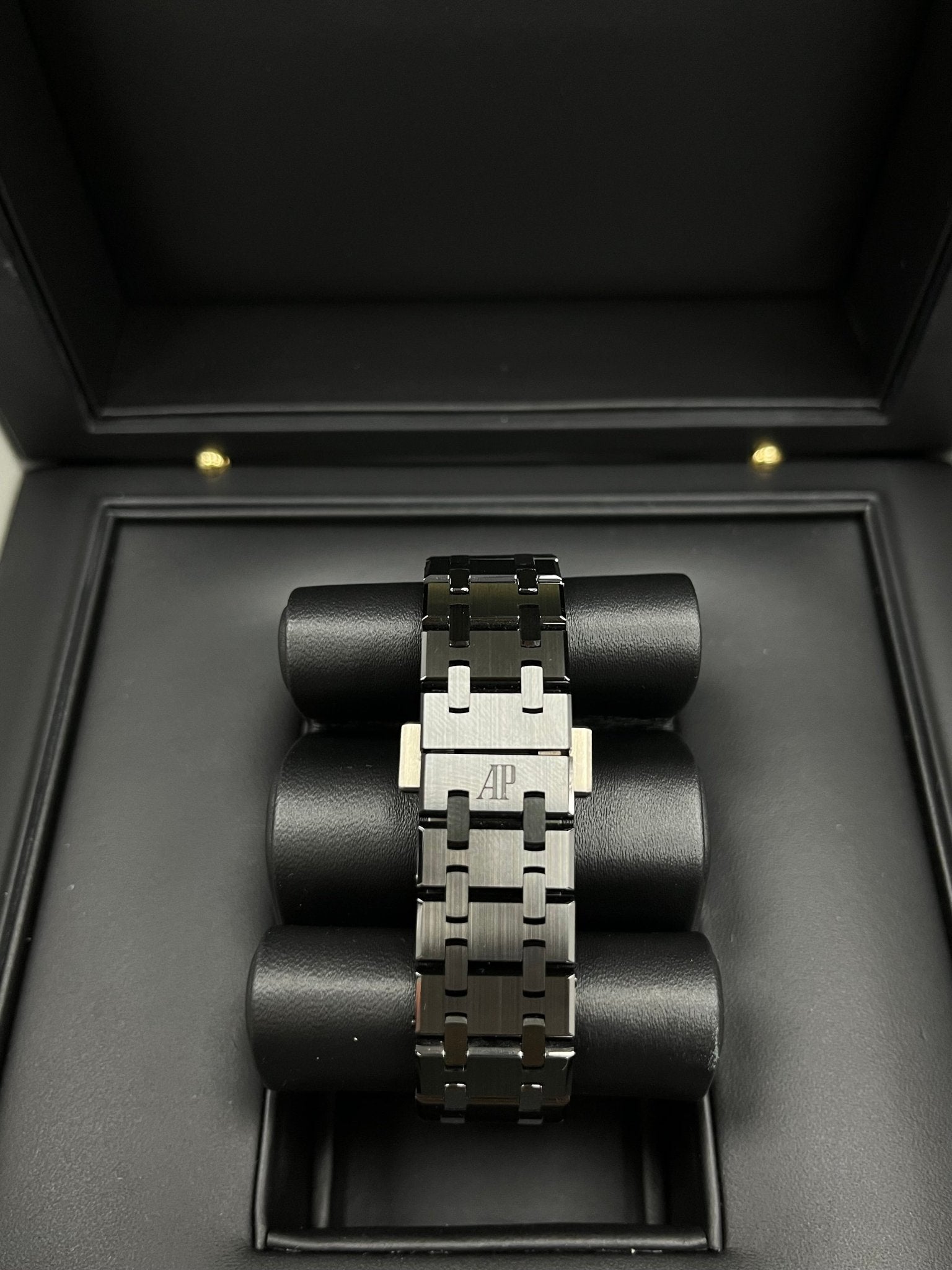 The sleek aesthetics of this 34 mm timepiece in black ceramics—the first dedicated to the slenderest wrists—is enhanced with pink gold accents for a refined two-tone contrast. Black ceramic case, 18-carat pink gold screws, glareproofed sapphire crystal and titanium caseback. Black dial with “Grande Tapisserie” pattern, pink gold applied hour-markers and Royal Oak hands with luminescent coating . Black ceramic bracelet with AP folding clasp