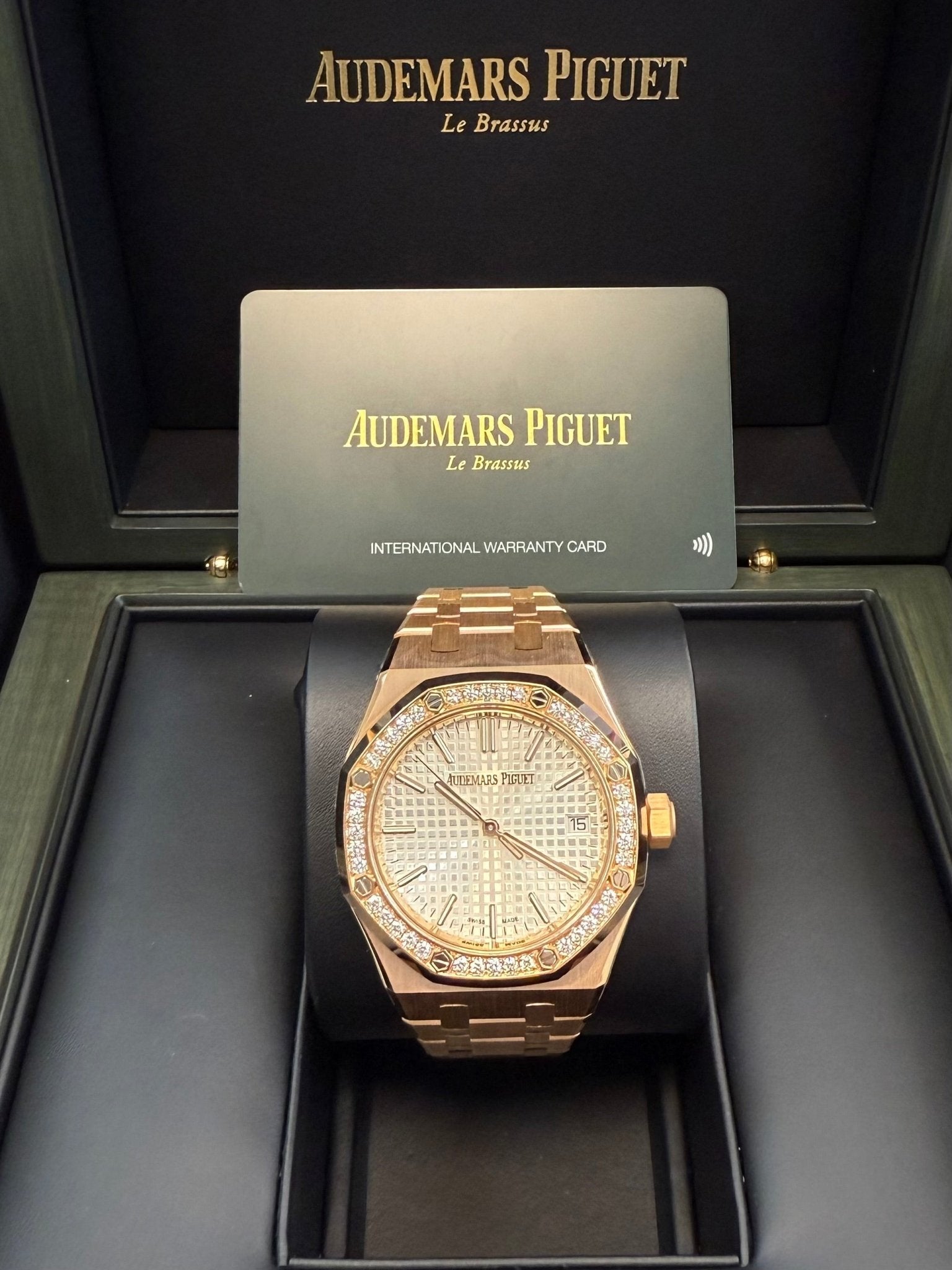 This 37 mm model benefits from the new Royal Oak design evolution and the new selfwinding Calibre 5900. Its 18-carat pink gold case and bracelet are contrasted with a silver-toned “Grande Tapisserie” dial and a diamond-set bezel. The “50-years” oscillating weight matches the case colour. 18-carat pink gold case, bezel set with brilliant-cut diamonds, glareproofed sapphire crystal and caseback. Silver-toned dial with “Grande Tapisserie” pattern, pink gold applied hour-markers and Royal Oak hands with luminescent coating.