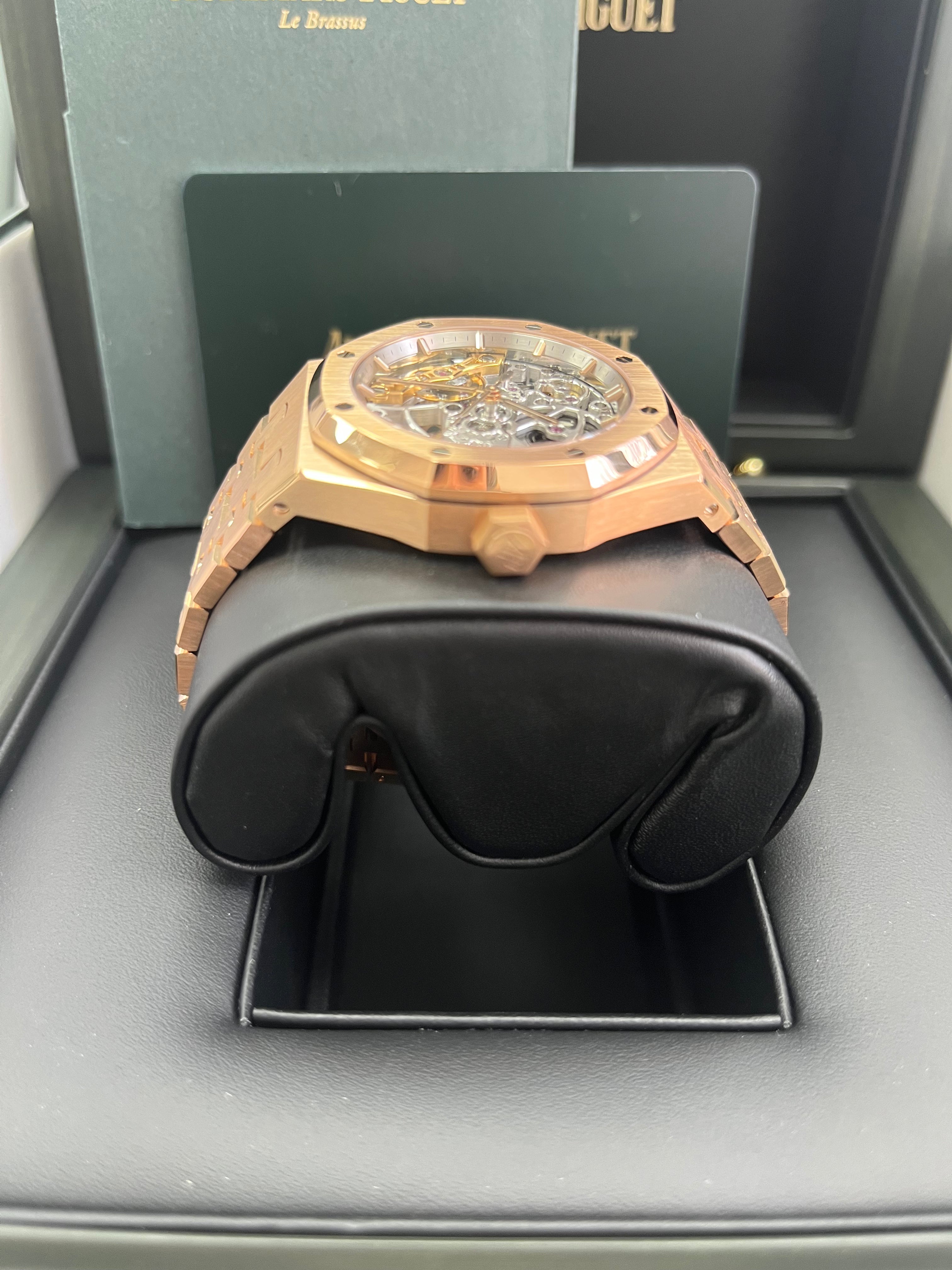 18-carat pink gold case, glare-proofed sapphire crystal, and case back, screw-locked crown. Manufacture calibre 3132, hours minutes, centre seconds with a selfwinding mechanism. The number of jewels is 38 Openworked rhodium-toned dial, pink gold applied hour-markers, and Royal Oak hands with luminescent coating. 18-carat pink gold bracelet with AP folding clasp. 18-carat pink gold bracelet with AP folding clasp. With a power reserve of 45h and water-resistant up to 50 meters.