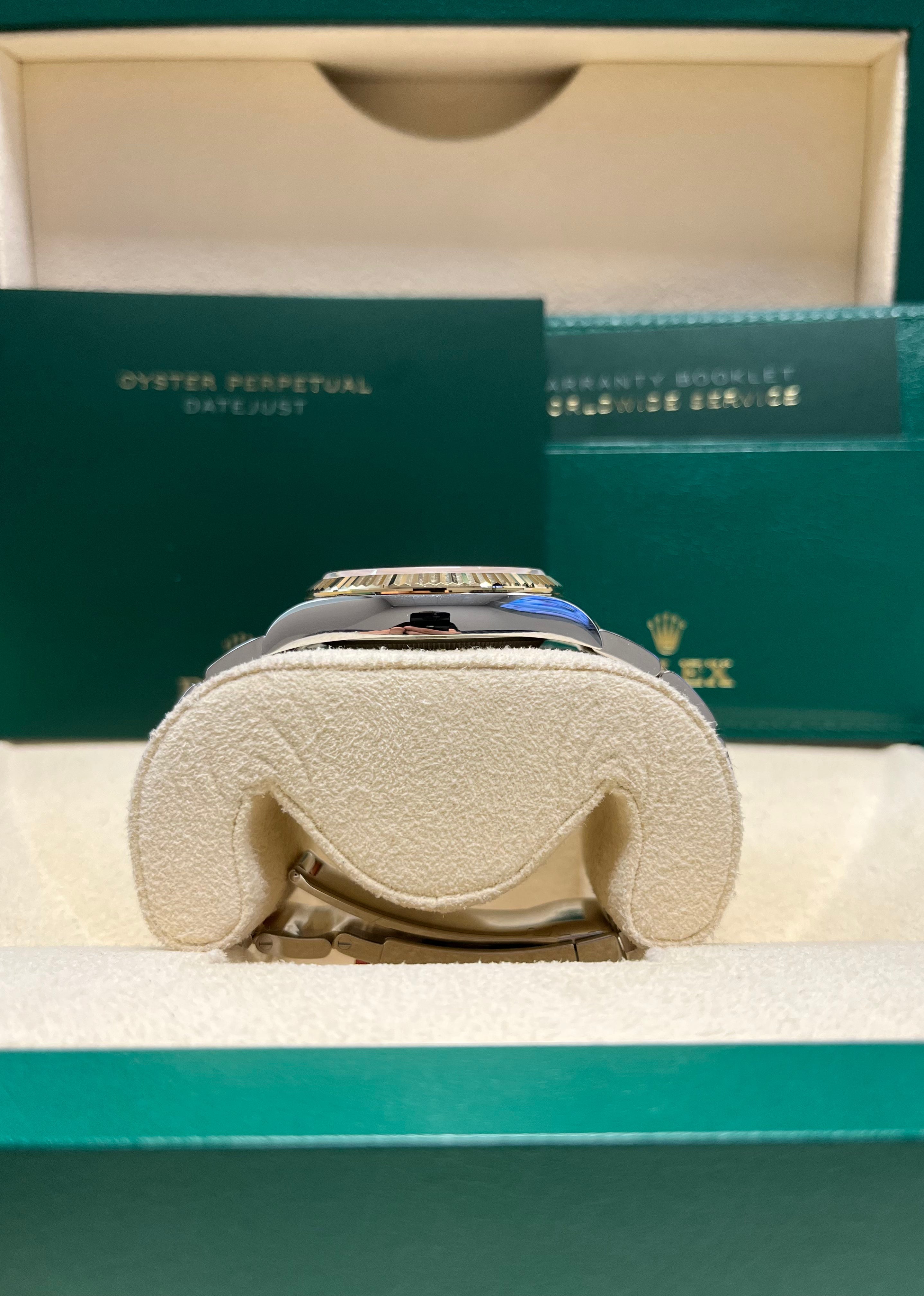 36mm Yellow Rolesor case with 904L steel monobloc middle case, screw-down steel back, 18K yellow gold screw-down crown, 18K yellow gold fluted bezel, scratch-resistant double anti-reflective sapphire crystal with cyclops lens over the date, golden fluted motif dial, index hour markers, Rolex calibre 3235 perpetual self-winding movement with date at 3 o’clock that changes instantaneously at midnight in a few thousandths of a second, approximately 70 hours of power reserve, yellow Rolesor Oyster bracelet made from a combination of 904L steel and 18K yellow gold with flat three-piece links, folding Oysterclasp buckle with Easylink 5mm comfort extension link. Waterproof to 100 meters.