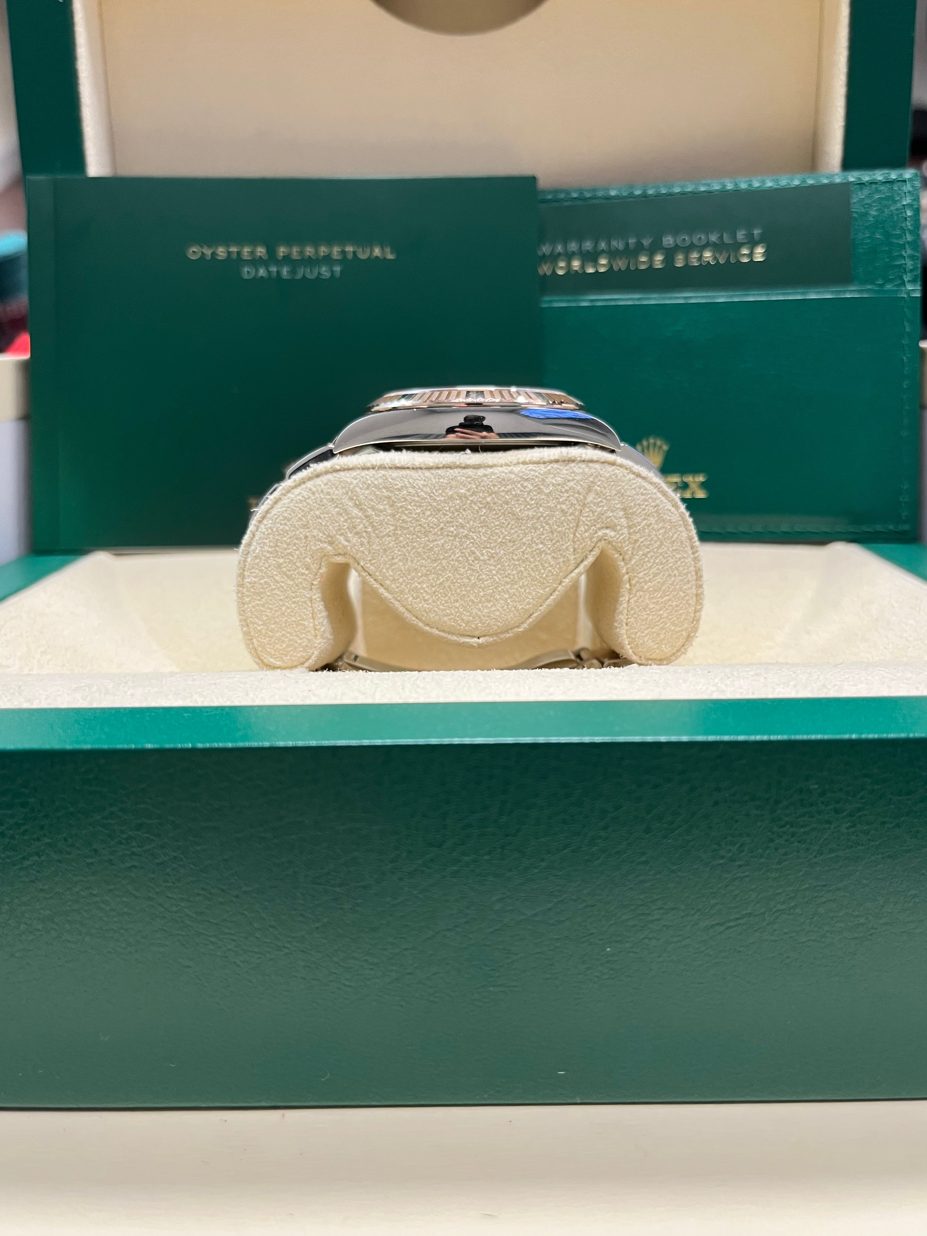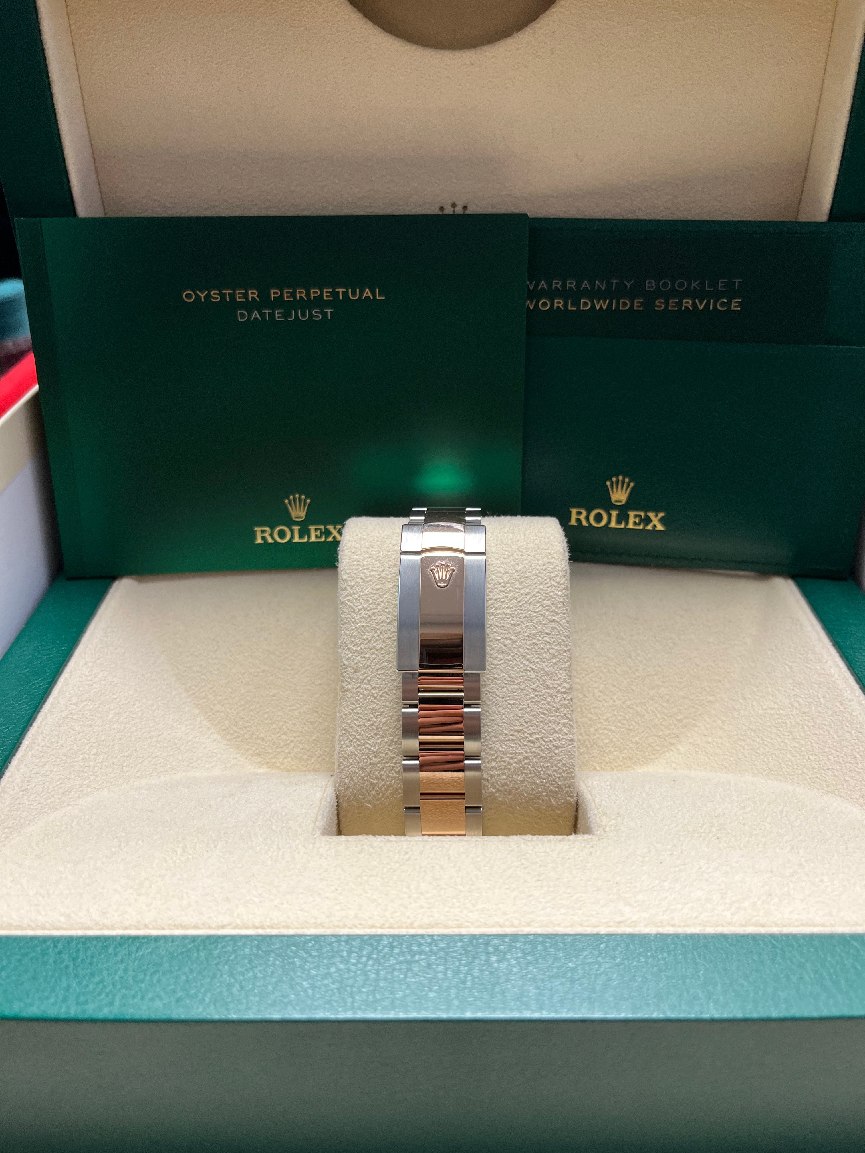 41mm Everose Rolesor case with 904L steel monobloc middle case, screw-down steel back, 18K Everose gold screw-down crown, 18K Everose gold fluted bezel, scratch-resistant double anti-reflective sapphire crystal with cyclops lens over the date, Sundust dial, diamond hour markers, Rolex calibre 3235 perpetual self-winding movement with date at 3 o’clock that changes instantaneously at midnight in a few thousandths of a second, approximately 70 hours of power reserve, Everose Rolesor Jubilee bracelet made from a combination of 904L steel and 18K Everose gold with five-piece links, folding Oyster-Clasp buckle with Easylink 5mm comfort extension link. Water-resistant up to 100 meters.