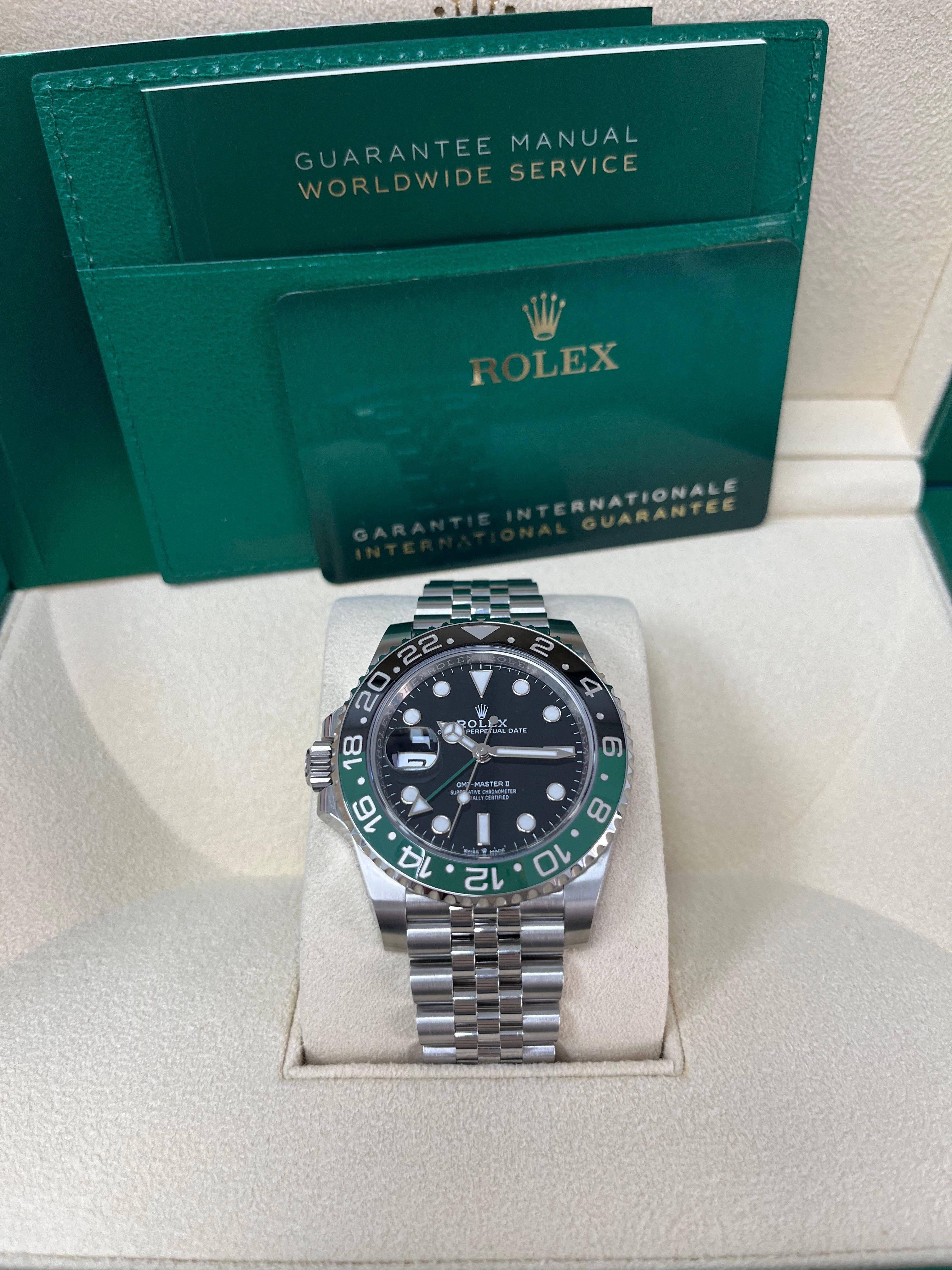 This model features a black dial and a two-colour Cerachrom bezel insert in green and black ceramic. Designed to show the time in two different time zones simultaneously during intercontinental flights, the GMT-Master II has come to be recognized for its robustness and versatile appearance.