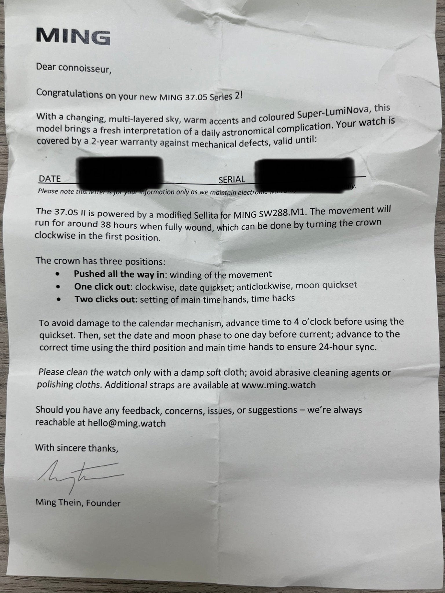Manual winding with~38 hours power reserve