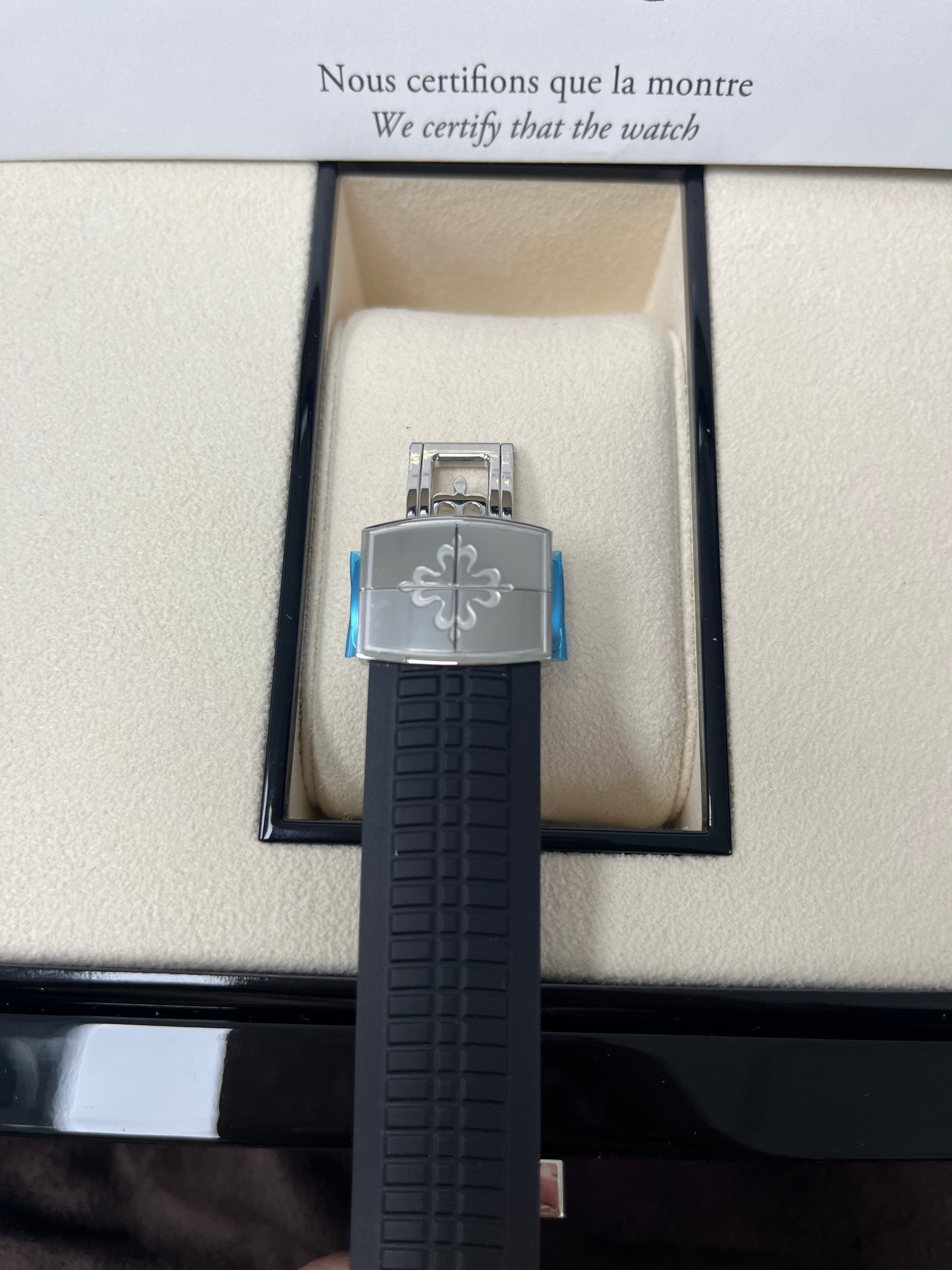 40.8 mm stainless steel case, sapphire-crystal back, black embossed dial with gold applied numerals and luminescent hour markers, caliber 324 S C FUS self-winding movement with Aquanaut Travel Time dual time zone mechanism indicating local and home time, local and home day/night indication in apertures, local date by hand, sweep seconds hand, approximately 35-45 hours of power reserve, black Tropical composite strap, Aquanaut fold-over buckle. Water-resistant up to 120 meters.