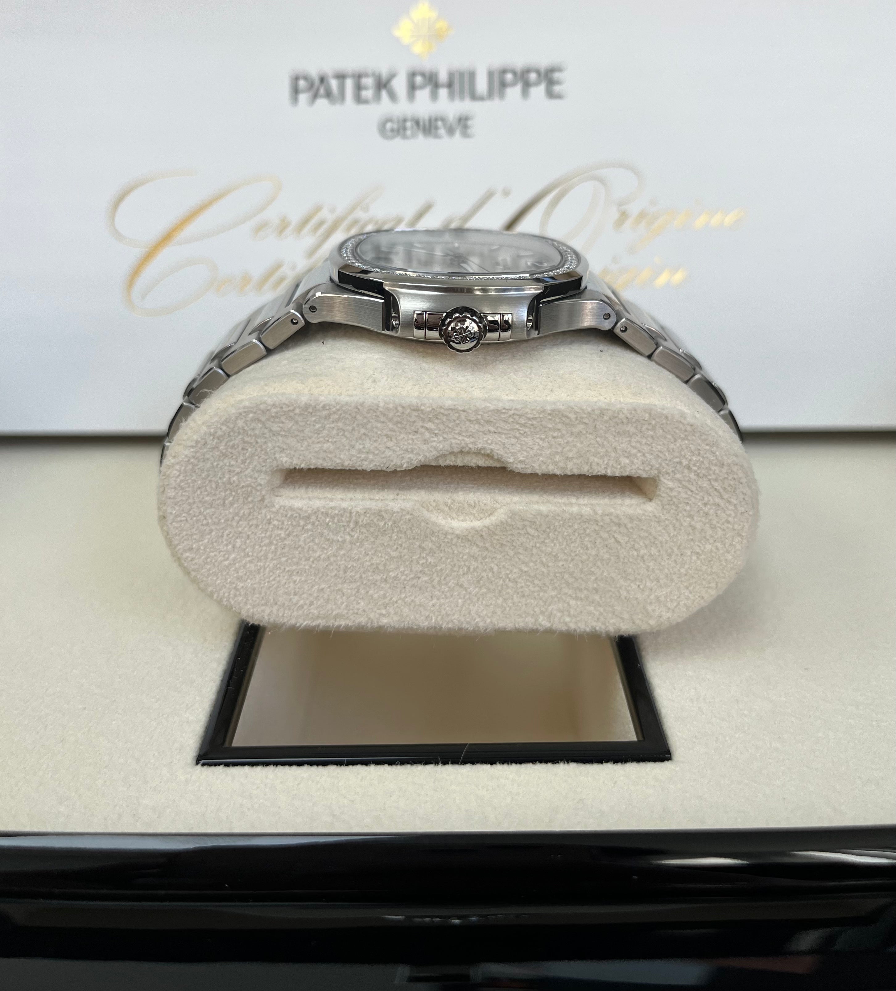 35.2 mm steel case, 8.62 mm thick, sapphire-crystal back, diamond-set bezel, silvery opaline dial with gold applied hour markers and numerals with luminescent coating, caliber 324 S C self-winding movement with date in an aperture, sweep seconds hand, approximately 35-45 hours of power reserve, steel bracelet, nautilus fold-over buckle. Water resistant to 60 m.