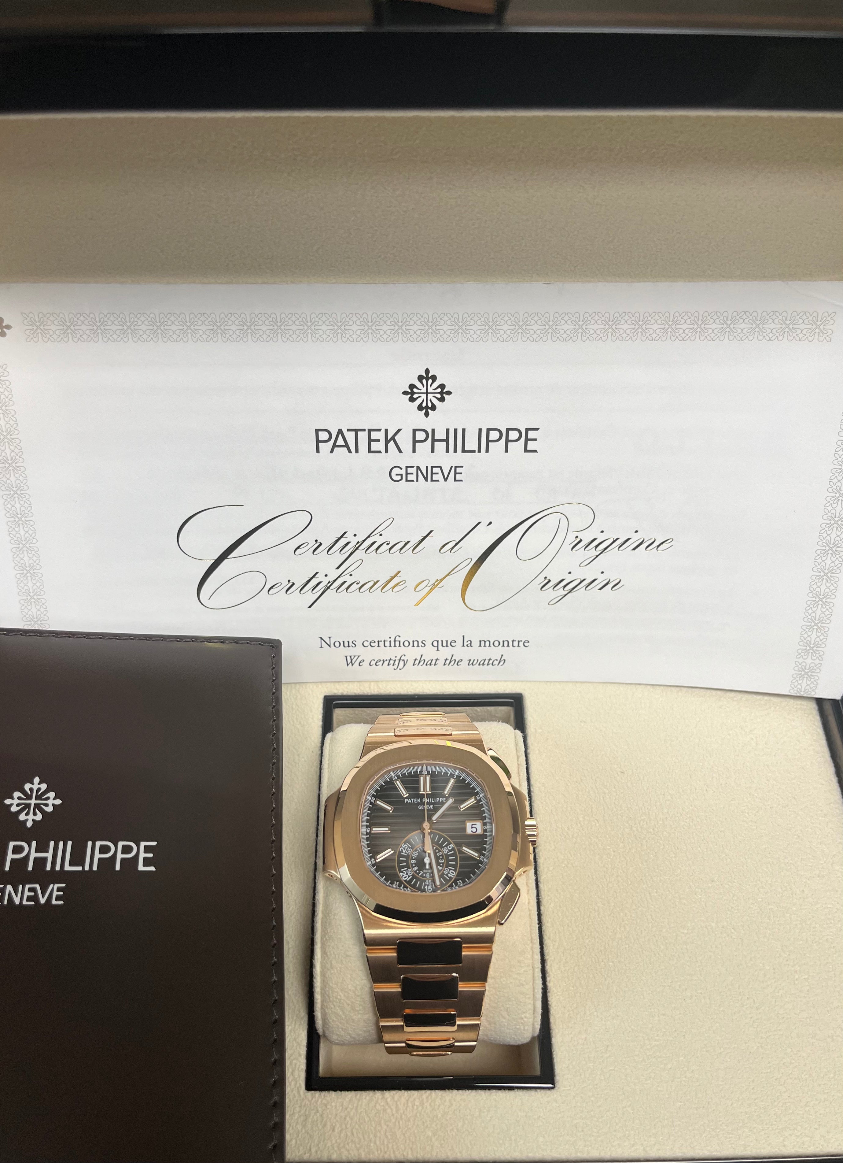 40.5mm 18K Rose Gold case, sapphire crystal back, black gradient dial with gold applied hour markers with luminescent coating, self-winding caliber CH 28-520 C movement with date, chronograph, 60-minute and 12-hour mono-counter at 6 o'clock, sweep seconds hand (chronograph hand), approximately 45-55 hours of power reserve, 18K rose gold bracelet Nautilus fold-over clasp. Water-resistant up to 120 meters.