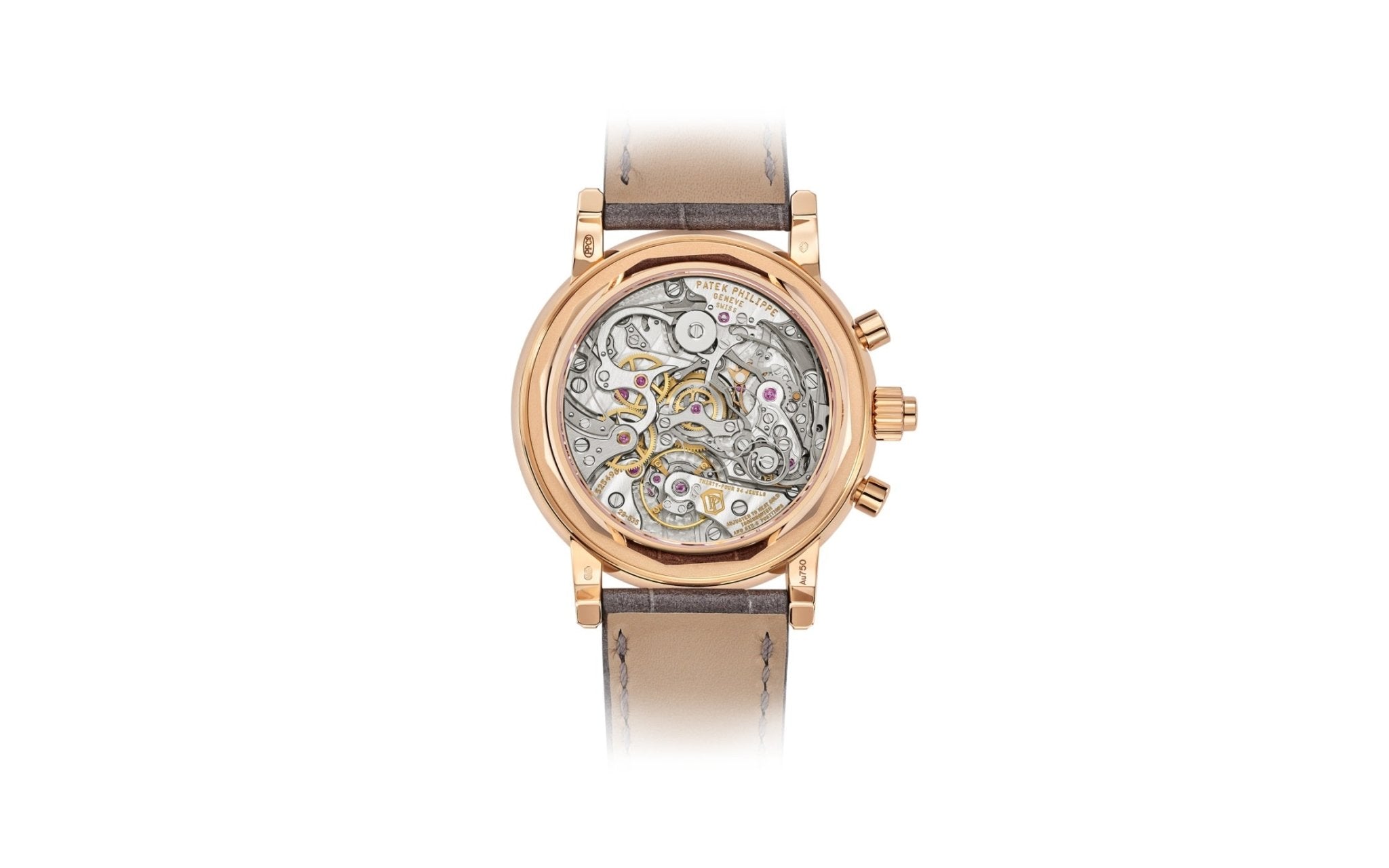 Patek Philippe reinterprets the Reference 5204R split-seconds chronograph and perpetual calendar in a contemporary spirit by combining a rose gold case with a matching slate gray dial and strap. This rare and refined nuance contributes to renewing the style of this much sought-after Grand Complication. The transparent sapphire caseback offers a magnificent immersion into the heart of caliber CHR 29-535 PS Q, with its traditional architecture (manual winding, two column wheels, horizontal clutch) combined with seven patented innovations and highly refined manual finishing.