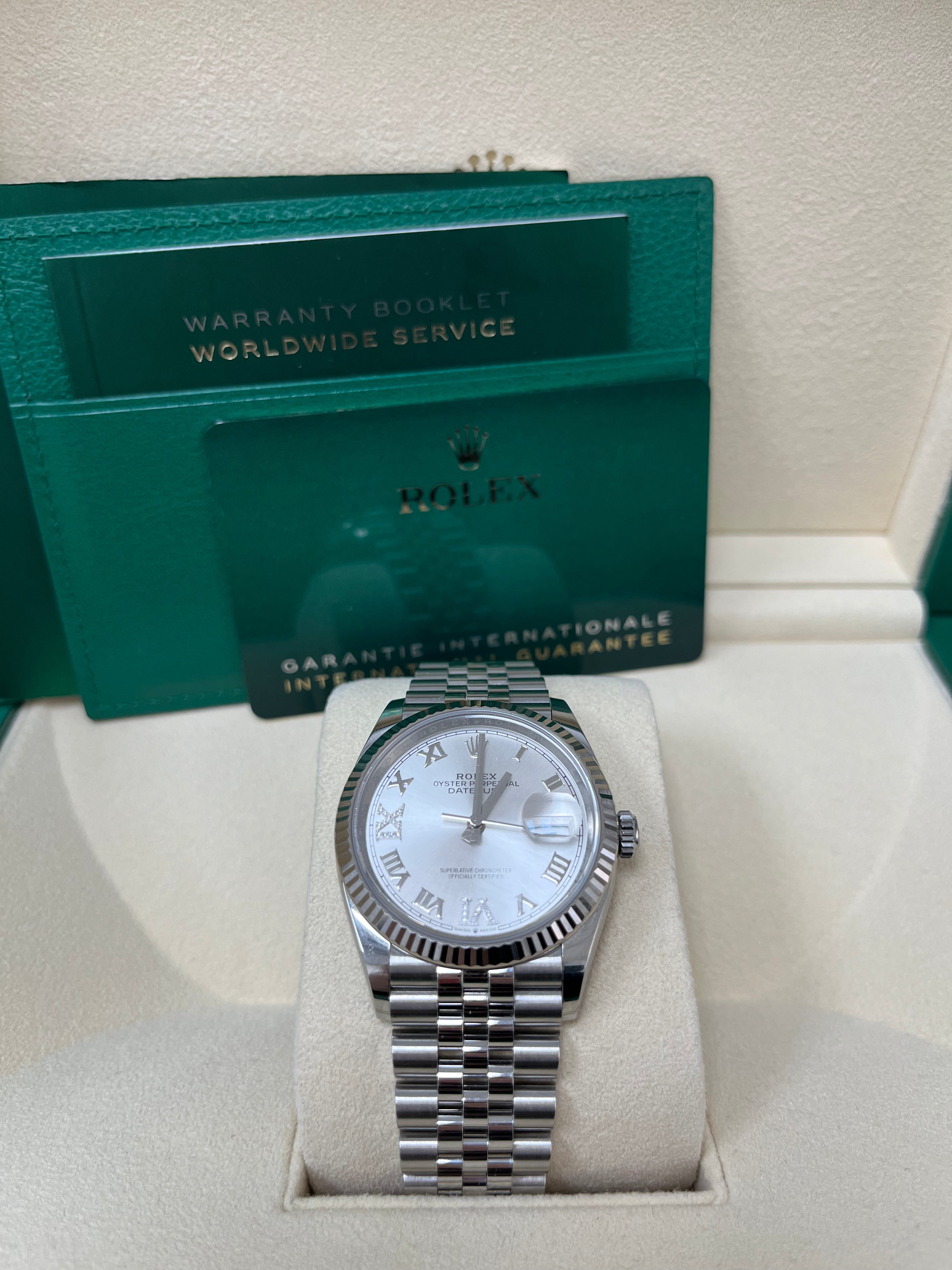 36mm Oystersteel case, screw-down steel back, screw-down crown with twinlock double waterproofness system, fluted bezel, scratch-resistant sapphire crystal with cyclops lens over the date, silver dial, Roman numerals with diamond set 6 and 9, Rolex calibre 3235 perpetual self-winding movement with center hour, minute and seconds hands, instantaneous date at 3 o’clock with rapid setting, and stop-seconds for precise time setting, approximately 70 hours of power reserve, Jubilee bracelet with five-piece links, folding Oysterclasp buckle with Easylink 5mm comfort extension link. Waterproof to 100 meters.