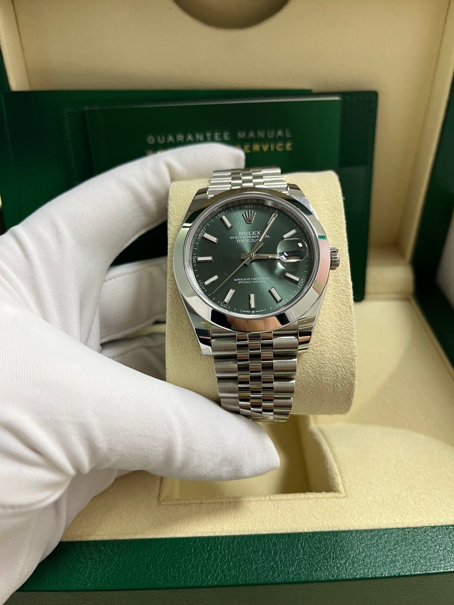 41mm Oystersteel case, screw-down back, screw-down crown with twinlock double waterproofness system, smooth bezel, scratch-resistant sapphire crystal with cyclops lens over the date, mint green dial, index hour markers, Rolex calibre 3235 perpetual self-winding movement with centre hour, minute and seconds hands, instantaneous date with rapid setting, and stop-seconds for precise time setting, approximately 70 hours of power reserve, Jubilee bracelet with five-piece links, folding Oysterclasp buckle with Easylink 5mm comfort extension link. Waterproof to 100 metres / 330 feet