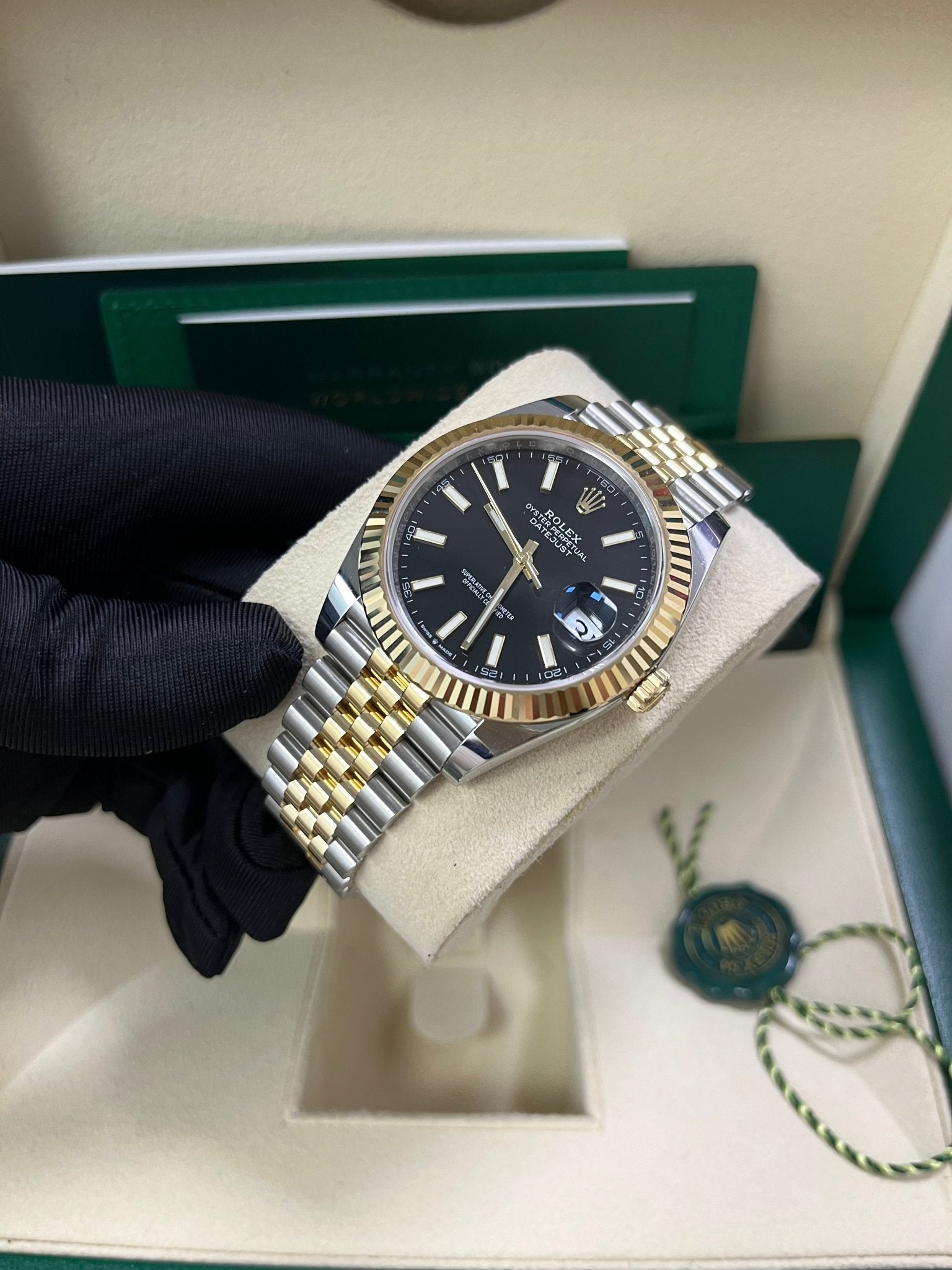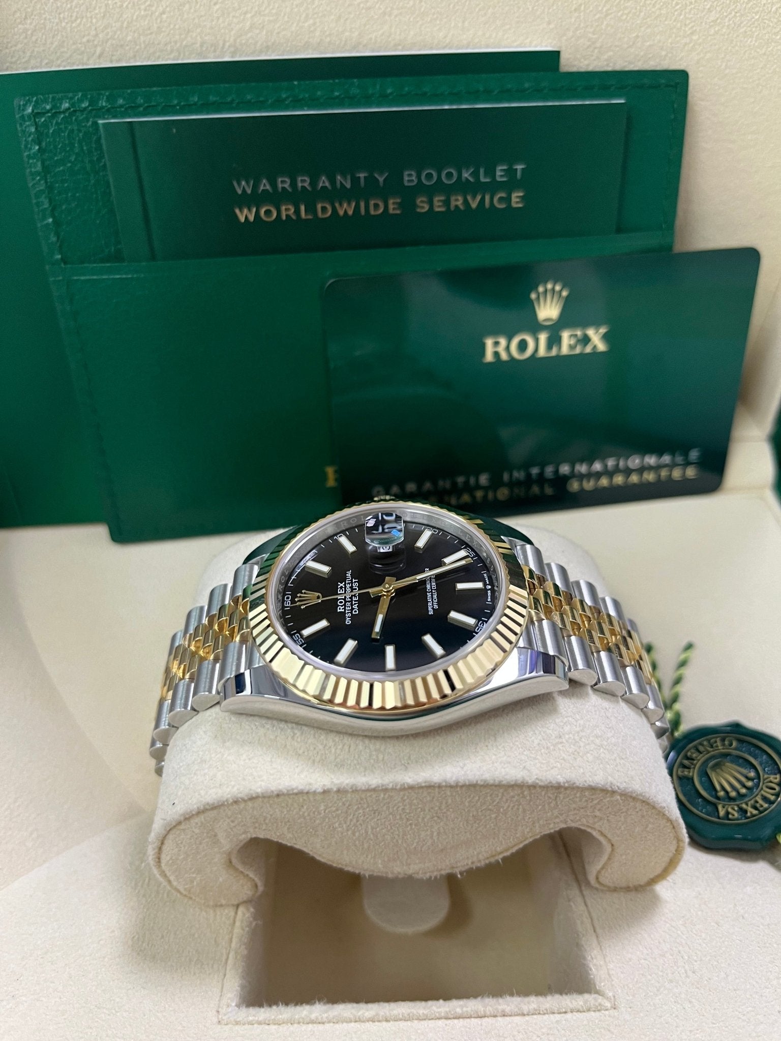 41mm Yellow Rolesor case with 904L steel monobloc middle case, screw-down steel back, 18K yellow gold screw-down crown, 18K yellow gold fluted bezel, scratch-resistant double anti-reflective sapphire crystal with cyclops lens over the date, black dial, index hour markers, Rolex calibre 3235 perpetual self-winding movement with date at 3 o’clock that changes instantaneously at midnight in a few thousandths of a second, approximately 70 hours of power reserve, yellow Rolesor Jubilee bracelet made from a combination of 904L steel and 18K yellow gold with five-piece links, folding Oysterclasp buckle with Easylink 5mm comfort extension link. Waterproof to 100 meters.