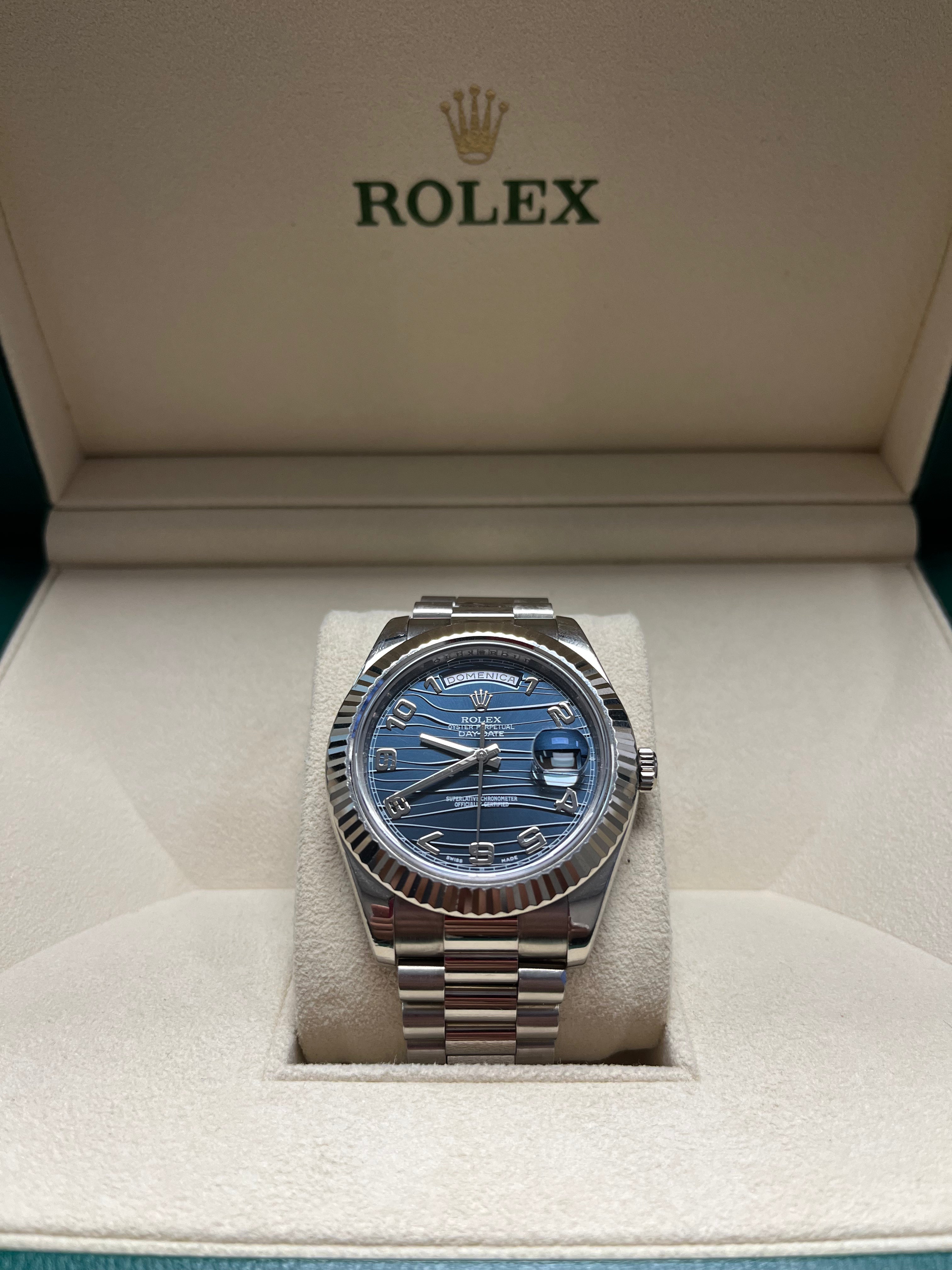 The Rolex President. 41mm 18K white gold case, fluted bezel, blue wave dial, Arabic numerals, and white gold President bracelet.