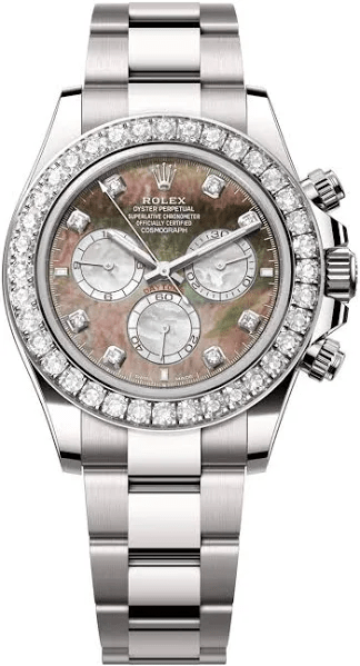 40mm 18K white gold case, screw-down back, screw-down crown with triplock triple waterproofness system, diamond bezel, scratch-resistant sapphire crystal scratch-resistant sapphire, black and white mother-of-pearl dial, diamond hour markers, 4131, manufacture Rolex perpetual, mechanical chronograph, self-winding movement with, approximately 72 hours of power reserve, Oyster bracelet with three-piece solid links, folding Oysterlock safety buckle with Easylink 5mm comfort extension link. Waterproof to 100 metres / 330 feet.
