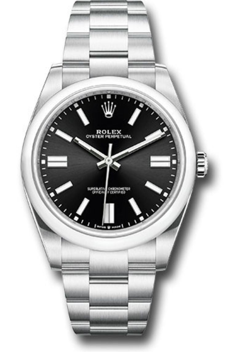 41mm Oystersteel case, screw-down crown with twinlock double waterproofness system, domed bezel, scratch-resistant sapphire crystal, bright black dial, index hour markers, Rolex calibre 3230 automatic movement with center hour, minute and seconds hands, and stop-seconds for precise time setting, approximately 70 hours of power reserve, Oyster bracelet with flat three-piece links, folding Oysterclasp buckle with Easylink 5mm comfort extension link. Waterproof to 100 meters.