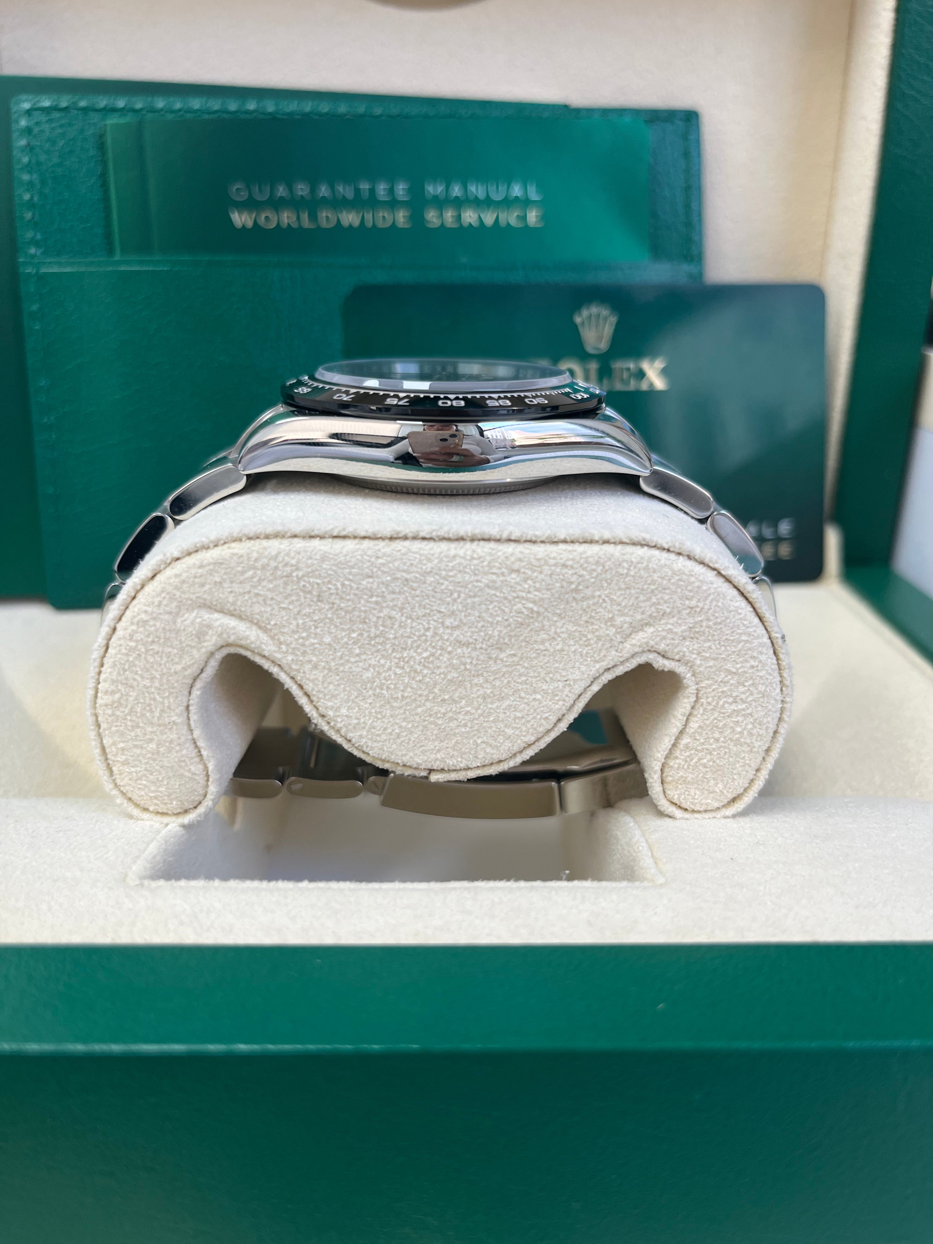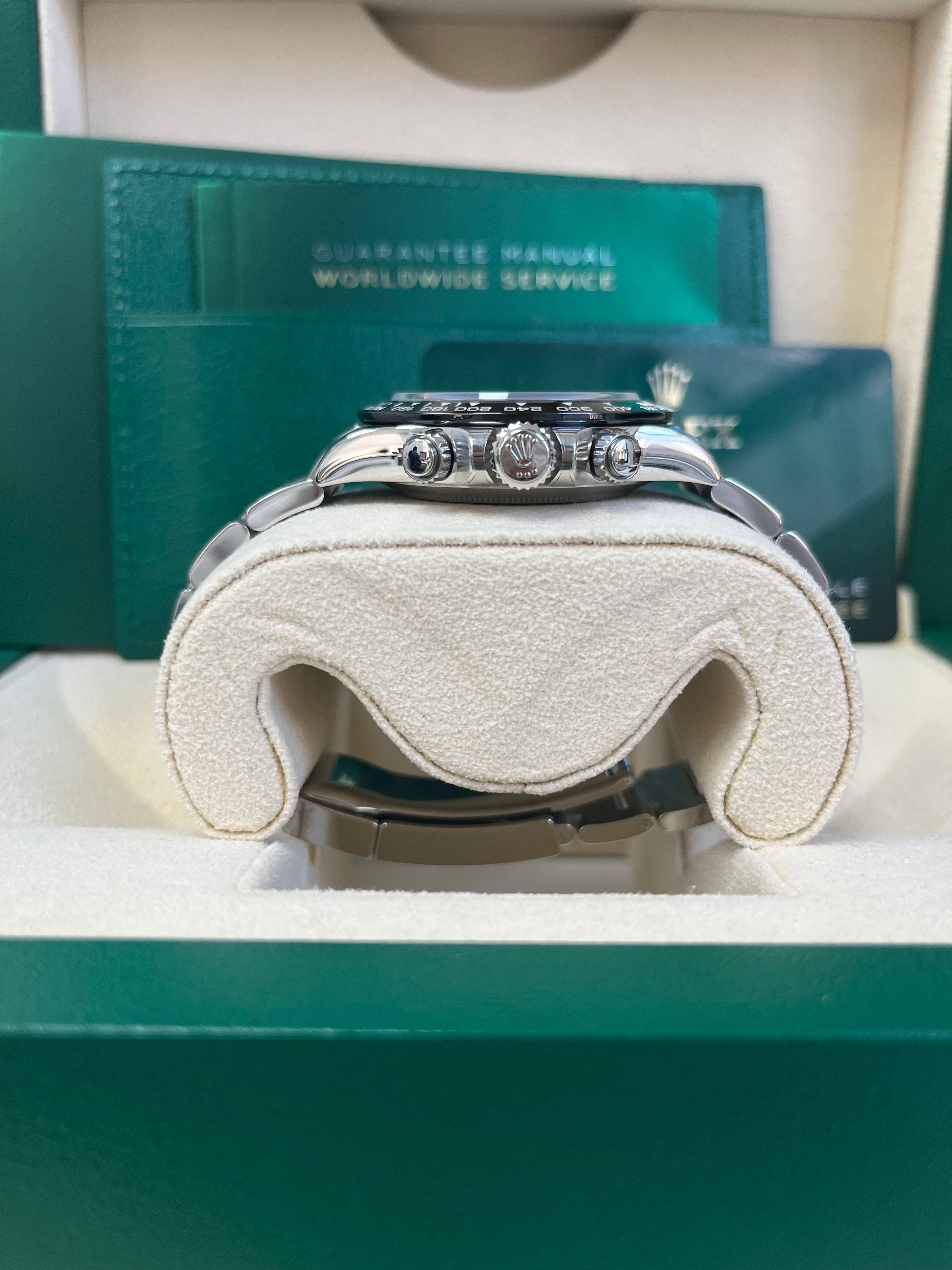 40mm polished 904L stainless steel case, screw-down back and push buttons, screw-down crown and push buttons with Triplock triple waterproofness, black monobloc ceramic Cerachrom bezel with engraved tachymetric scale, scratch-resistant sapphire crystal, black lacquer dial, 18K white gold applied applique hour markers with Chromalight, grey snailed counters, automatic movement with chronograph central second hand, 30-minute counter at 3 o’clock, and 12-hour counter at 9 o’clock, approximately 72 hours of power reserve, 904L stainless steel Oyster bracelet with solid links, folding Oysterlock buckle with Easylink 5mm comfort extension link. Waterproof to 100 meters. Prices of Rolex Daytona Watch continue to rise due to very limited production levels. Introduced at Baselworld 2016 Website. 2020.