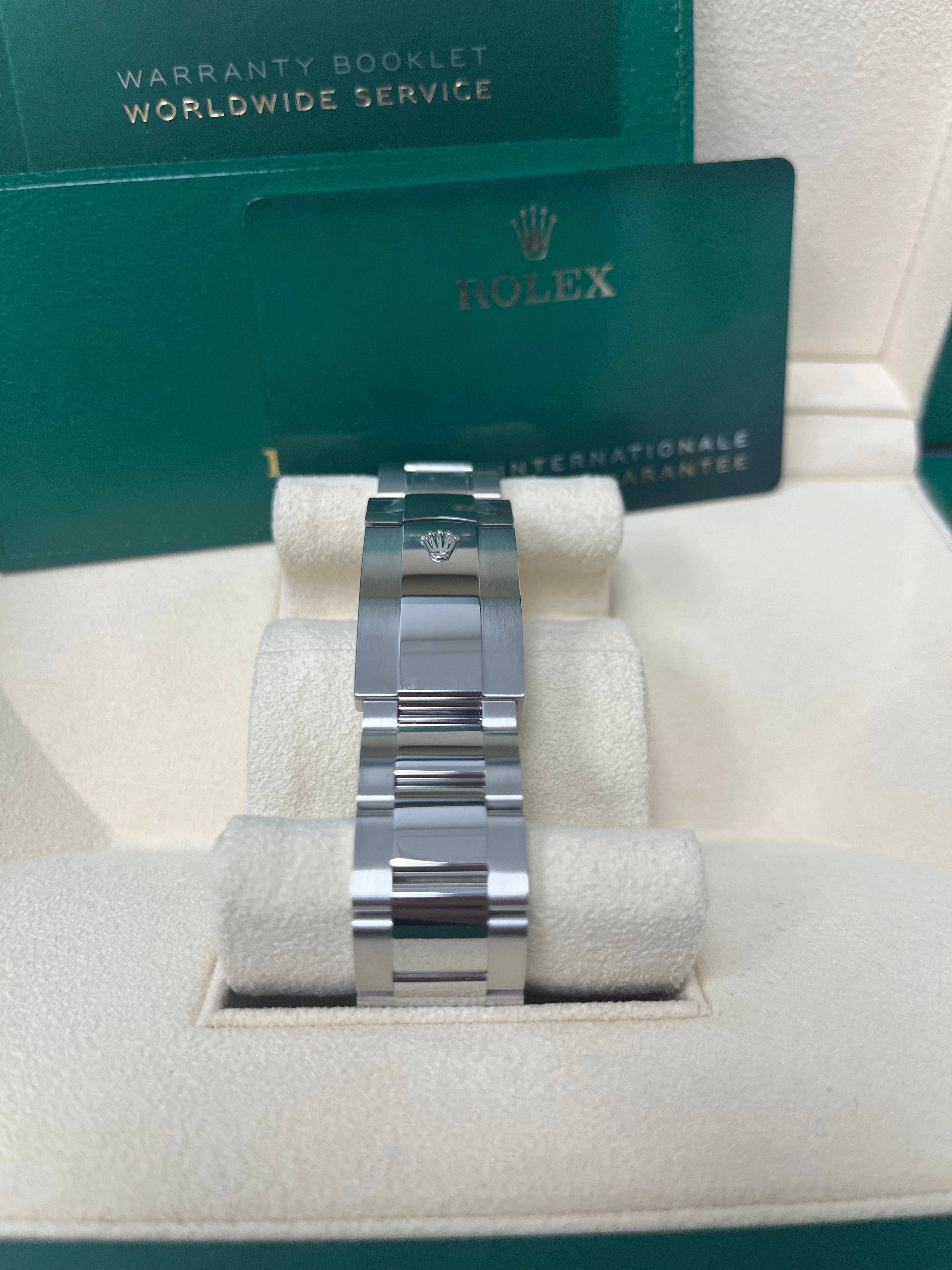 42mm white Rolesor case comprised of a 904L steel monobloc middle case, screw-down back, screw-down crown, 18K white gold fluted bezel with bidirectional rotatable Rolex Ring Command, scratch-resistant sapphire crystal with cyclops lens over the date and double anti-reflective coating, black dial, index hour markers, Rolex calibre 9001 automatic movement, second time-zone displayed via off-center rotating disc, Saros annual calendar with a date at 3 o’clock and month indicated in discrete apertures at each of the 12-hour marks, stainless steel Oyster bracelet, folding Oysterclasp buckle with Easylink 5mm comfort extension link. Waterproof to 100 meters. 2020. v