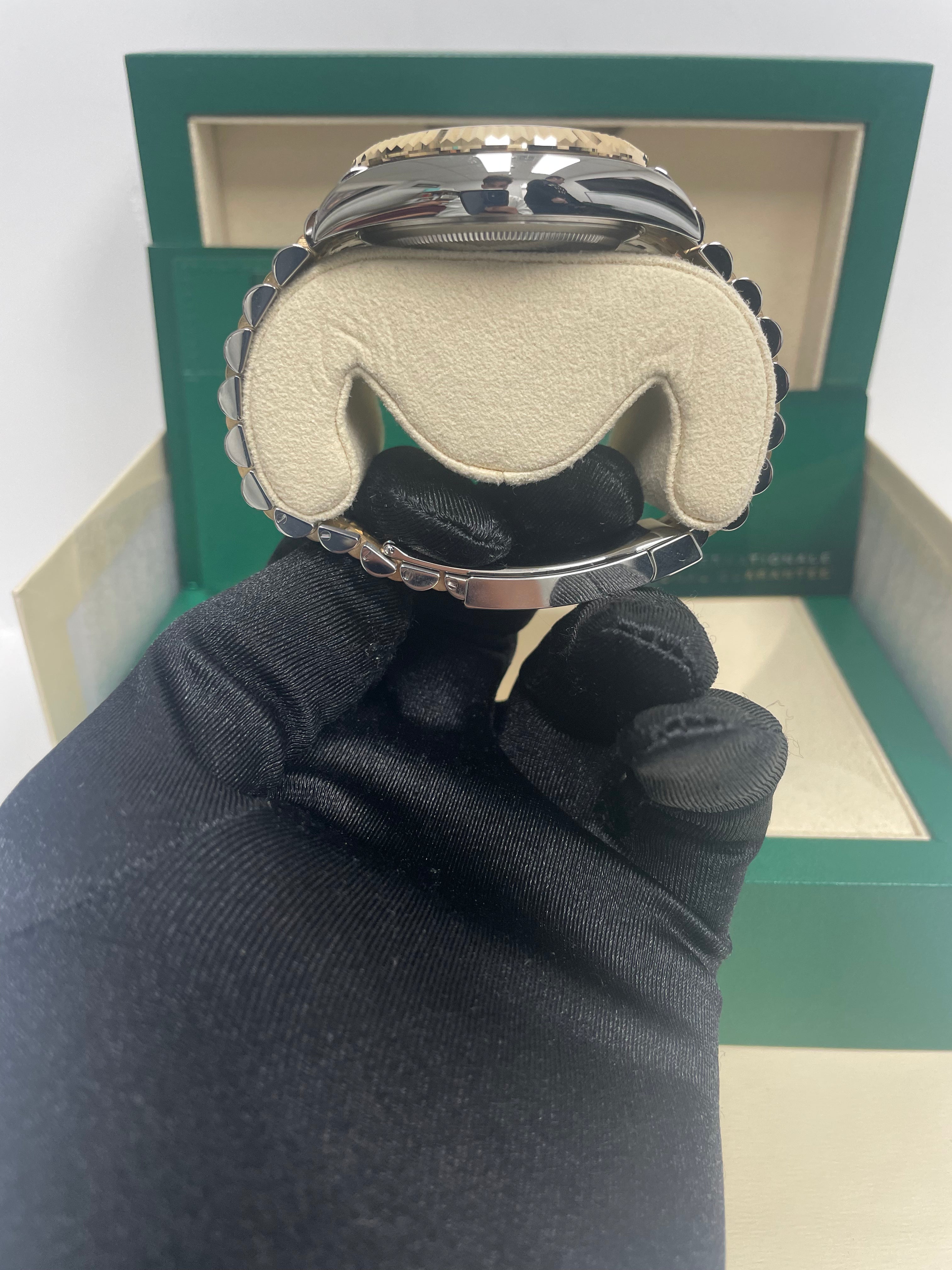 42mm yellow Rolesor case comprised of a 904L steel monobloc middle case, screw-down back, screw-down crown, 18K yellow gold fluted bezel with bidirectional rotatable Rolex Ring Command, scratch-resistant sapphire crystal with cyclops lens over the date and double anti-reflective coating, champagne dial, index hour markers, Rolex calibre 9001 automatic movement , second time-zone displayed via off-center rotating disc, Saros annual calendar with date at 3 o’clock and month indicated in discrete apertures at each of the 12 hour marks, stainless steel and 18K yellow gold Jubilee bracelet, folding Oysterclasp buckle with Easylink 5mm comfort extension link. Waterproof to 100 meters.