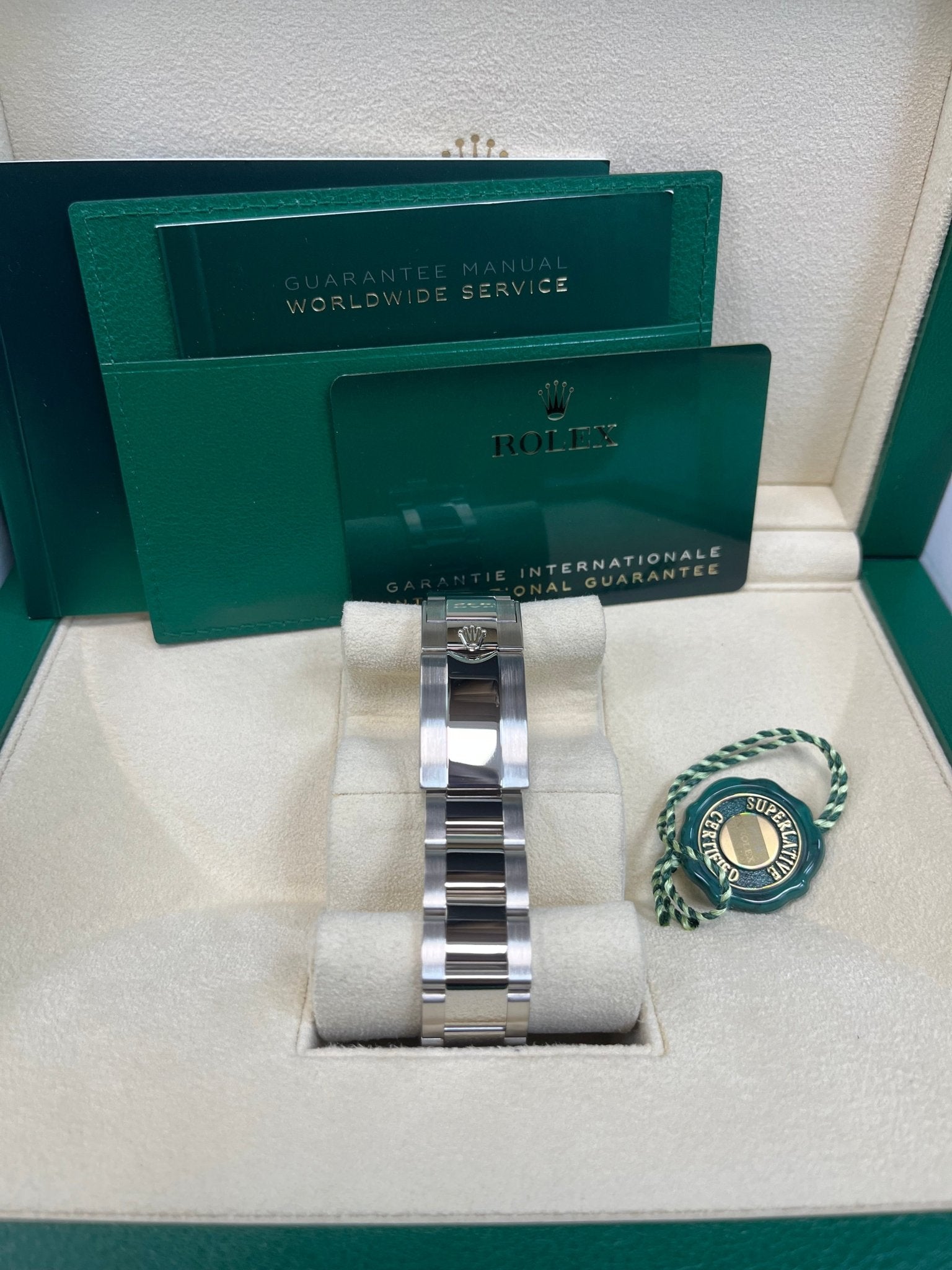 40mm 18K white gold case, screw-down crown with triplock triple waterproofness system, bidirectional rotatable 24-hour graduated bezel with blue and red Cerachrom insert and engraved numerals and graduations, scratch-resistant sapphire crystal with cyclops lens over the date and double anti-reflective coating, meteorite dial, Chromalight hour markers, Rolex calibre 3285 automatic movement with second time-zone hour hand and instantaneous date, approximately 70 hours of power reserve, white gold Oyster bracelet with flat three-piece links, folding Oysterlock buckle with Easylink 5mm comfort extension link. Waterproof to 100 meters. Baselworld 2019 release.