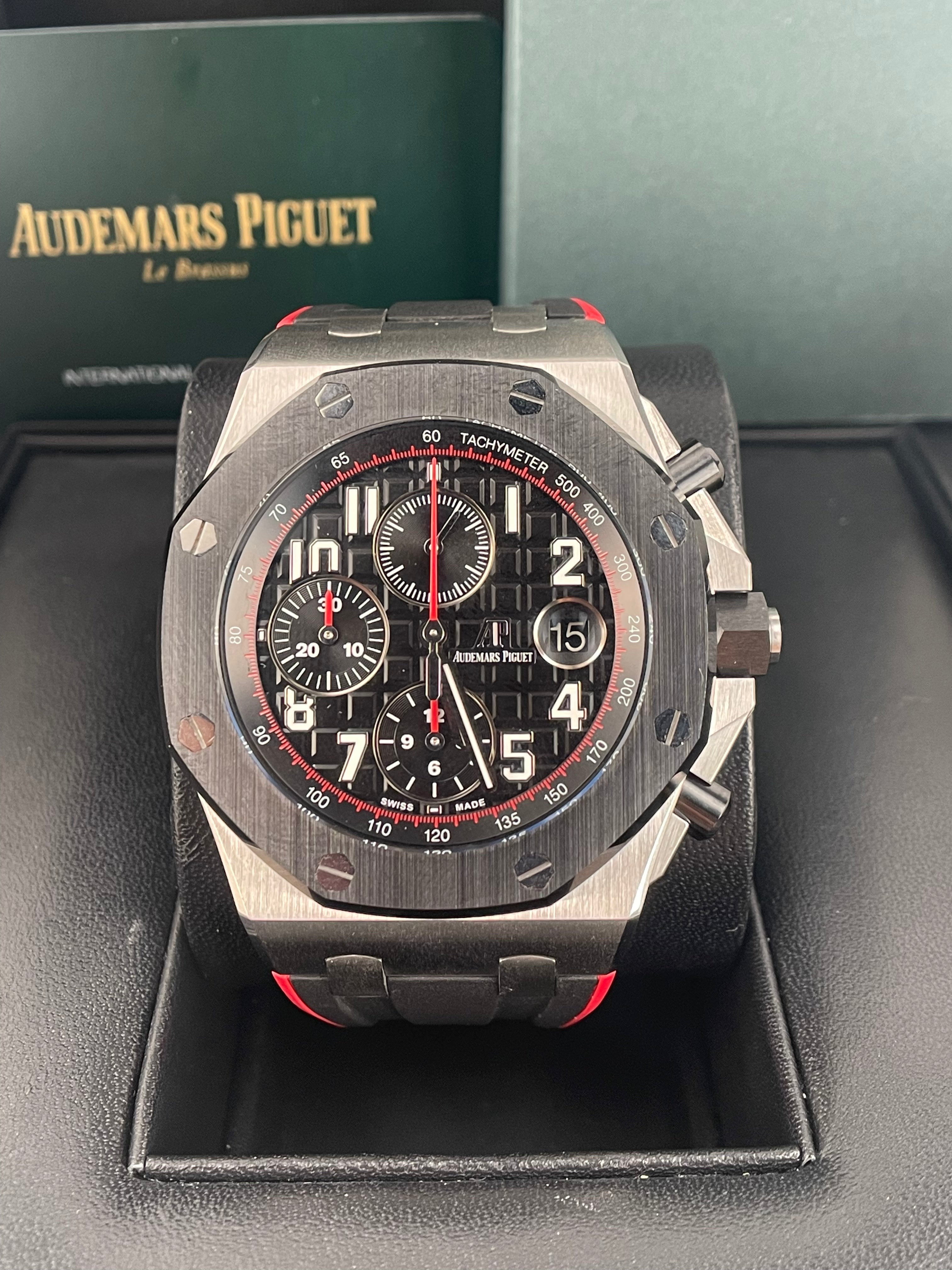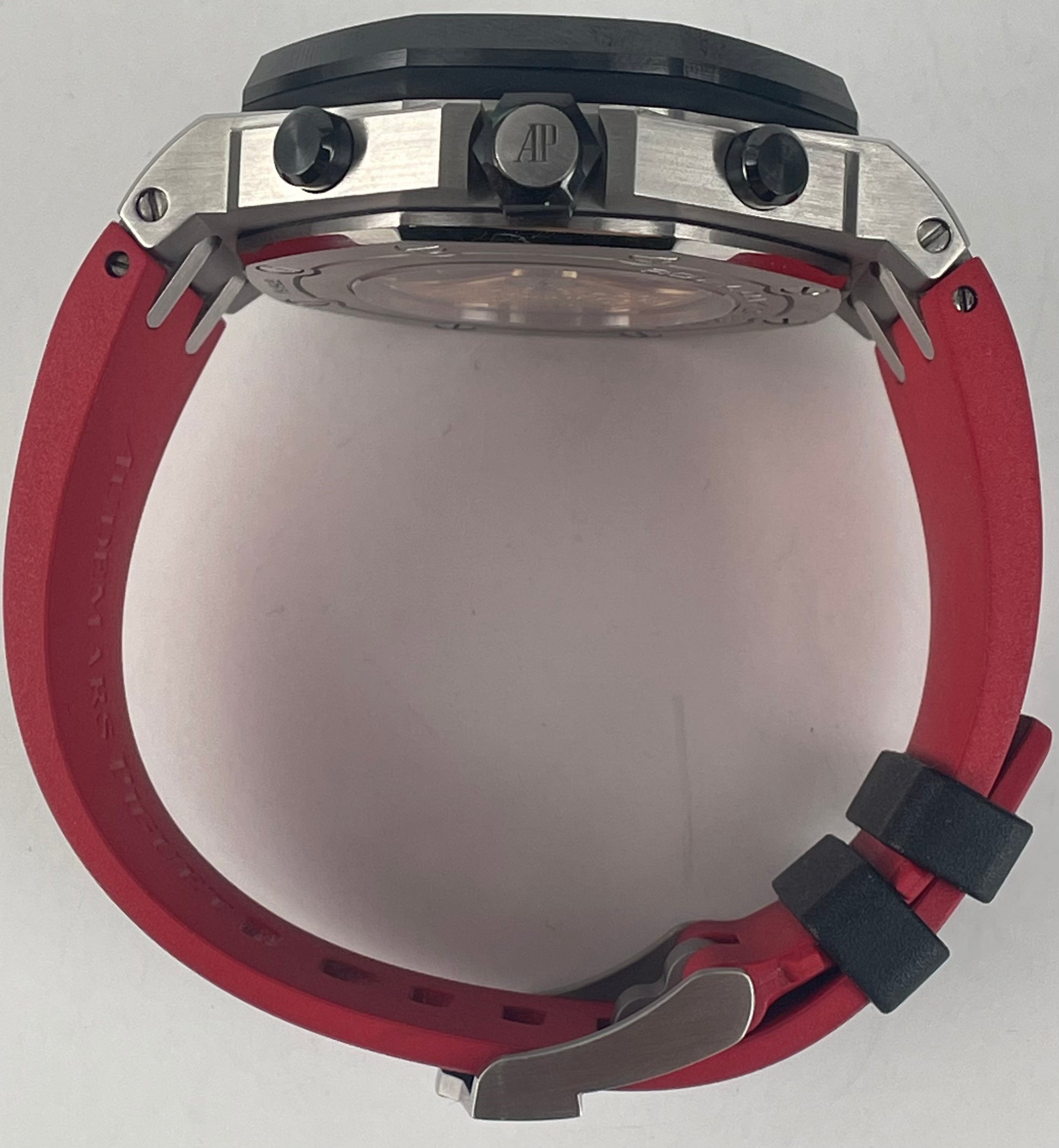 42 mm stainless steel case, 14.6 mm thick, glareproofed sapphire crystal back, black ceramic pushpieces and screw-locked crown, black ceramic bezel, glareproofed sapphire crystal, black dial with Méga Tapisserie pattern, black counters, Arabic numerals with luminescent coating, white gold Royal Oak hands with luminescent coating, Calibre 3126/3840 selfwinding movement with chronograph, hours, minutes, small seconds, date, approximately 50 hours of power reserve, two-ton black and red rubber strap, stainless steel pin buckle. Water resistant to 100 meters.
